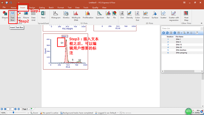 b.將細(xì)胞周期分析的模板調(diào)出來(lái)之后,點(diǎn)擊OK,會(huì)彈出如下圖所示的界面,然后可以利用insert按鈕,插入文本框,從而可實(shí)現(xiàn)圖注的編輯,如下圖所示(我們可以對(duì)圖中的每個(gè)峰進(jìn)行命名,從而可以對(duì)細(xì)胞周期中的各個(gè)時(shí)期進(jìn)行命名和解釋):