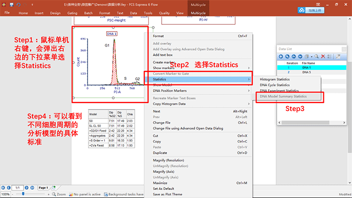 c.當(dāng)完成細(xì)胞周期數(shù)據(jù)分析后,接上面一步,可以通過(guò)Statistics按鈕,將相關(guān)的參數(shù)調(diào)出來(lái),具體展示如下: