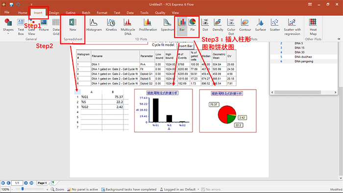 a.舉例,對(duì)細(xì)胞周期中G1期,S期及G2期各細(xì)胞比列的情況分析并做成柱形圖及餅狀圖,直接插入Spreadsheets,然后將相應(yīng)的數(shù)據(jù)拖拽入表格中,點(diǎn)擊insert命令按鈕,插入相應(yīng)的柱形圖和餅狀圖,操作如下: