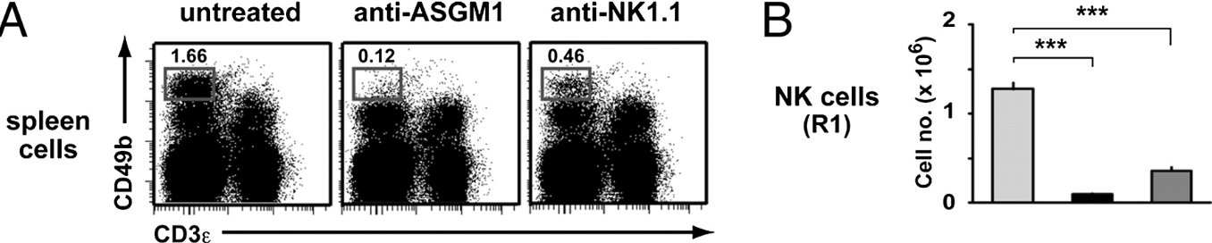 文獻(xiàn)來源:Nishikado H, et al. 2011. J. Immunol. 186:5766. 該圖顯示C57BL/6小鼠分別腹腔注射anti-ASGM1(10ul)或anti-NK1.1(300ug)一天之后,分離脾臟細(xì)胞染色,NK細(xì)胞(CD49bhighCD3ε?)的染色結(jié)果。