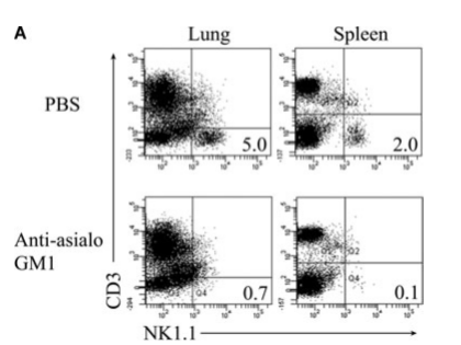 文獻(xiàn)來源:Zhou G, et al. 2013. Eur. J. Immunol. 43:929. 該圖顯示尾靜肪注射anti-asialo GM1PBS,每五天一次,不管是肺還是脾臟,都顯示出NK細(xì)胞消耗率。