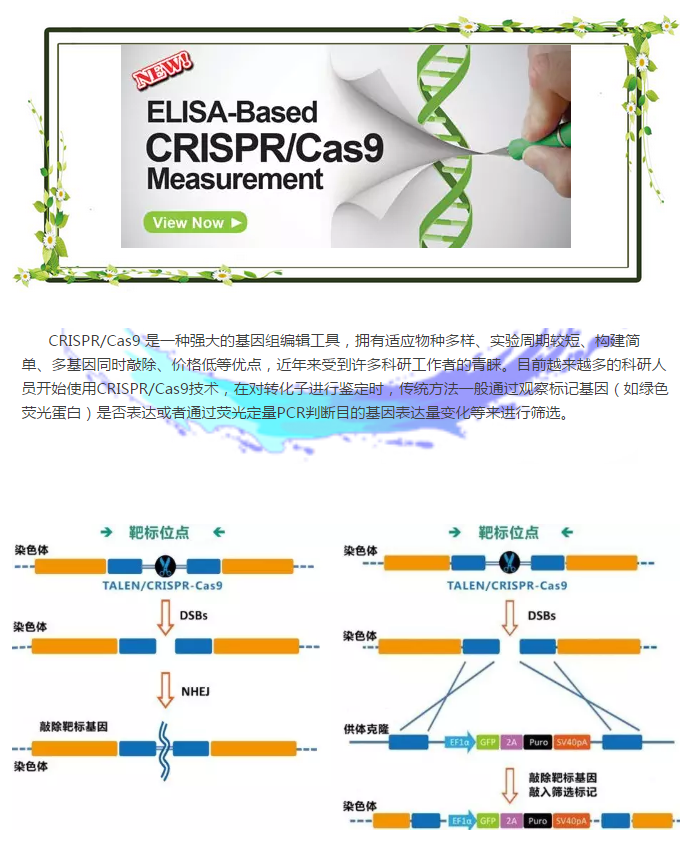 傳統(tǒng)方法操作復(fù)雜、花費(fèi)大量時(shí)間與精力,針對(duì)這個(gè)特點(diǎn),Epigentek研發(fā)出了通過ELISA檢測(cè)Cas9蛋白含量,進(jìn)而篩選轉(zhuǎn)化子的檢測(cè)試劑盒。該試劑盒僅需要純化的Cas9 核酸酶和全細(xì)胞提取物(分離自各物種的組織和培養(yǎng)的細(xì)胞),就能夠特異性定量檢測(cè)CRISPR相關(guān)蛋白9(Cas9,dCas9)。