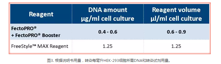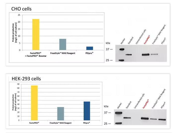 圖2. FectoPRO?大幅提高懸浮CHO和HEK-293細胞的蛋白產(chǎn)量。按1×106個細胞/ml的密度將FreeStyle? CHO-S和HEK-293F細胞培育在30 ml的無血清培養(yǎng)基中,并依照每種試劑說明書推薦用量FectoPRO?+FectoPRO?輔助藥劑Booster (0.4 μg DNA/ml)、FreeStyle?MAX試劑(1.25 μg DNA/ml)或PEIpro?(1 μg DNA/ml)進行轉(zhuǎn)染。用蛋白質(zhì)G親和性定量法(HPLC)和Western Blot檢測轉(zhuǎn)染后72小時(CHO細胞)和120小時(HEK-293細胞)的IgG3-Fc (34 kDa)的產(chǎn)量。