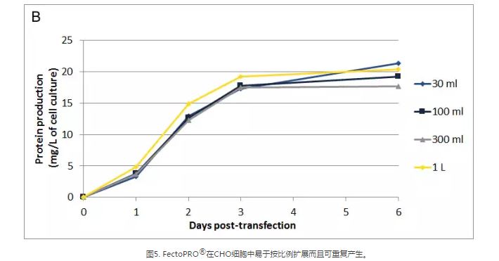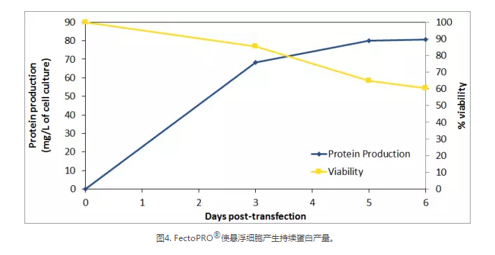 過去幾年,蛋白質(zhì)生產(chǎn)的持續(xù)時間有所增加,大部分蛋白質(zhì)生產(chǎn)過程持續(xù)1~2周,以獲得最佳的蛋白產(chǎn)量。FectoPRO?確保幾天內(nèi)產(chǎn)生持續(xù)的蛋白產(chǎn)量,同時保持較高的細胞活力以延長蛋白生產(chǎn)。