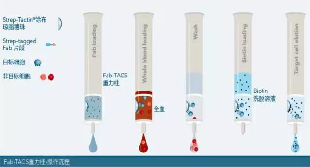 Fab-TACS重力柱內(nèi)裝有經(jīng)Strep-Tactin?涂布的細(xì)胞級(jí)中型瓊脂糖珠(cell-grade agarose matrix),如此一來(lái),含有Twin-Strep-tag?的Fab片段(Fab-Streps)能與瓊脂糖珠結(jié)合。將全血或血液樣本加入重力柱,此時(shí)目標(biāo)細(xì)胞會(huì)與Fab-Streps進(jìn)行特異性結(jié)合,非目標(biāo)細(xì)胞則會(huì)直接流出。隨后,清洗重力柱將多余的非目標(biāo)細(xì)胞或血液雜質(zhì)洗去。最后,加入生物素(biotin)中斷Fab-Streps與Strep-Tactin?間的結(jié)合,與此同時(shí),低親和力的Fab-Streps也會(huì)從目標(biāo)細(xì)胞上解離,而您便能獲得不含標(biāo)記、幾近原始的目標(biāo)細(xì)胞來(lái)進(jìn)行后續(xù)的實(shí)驗(yàn)。
