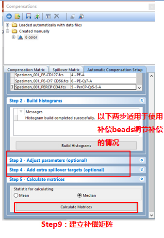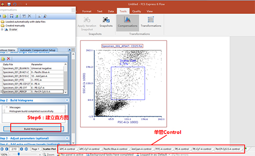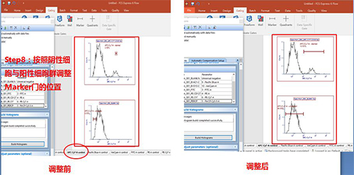 依次調整好各單管Control的Marker門的位置。此處不一一列舉?;氐窖a償界面。此處的3、4適用于使用補償beads調節(jié)補償的情況(由于本次數據為細胞,此處不詳細列出,如對此步驟感興趣,可咨詢小達君)