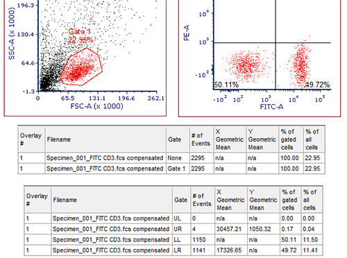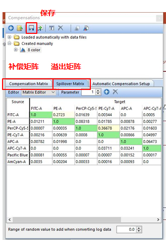 出現補償編輯欄,從PE通道中去除FITC的熒光信號,使PE通道的Mean/Median值與陰性細胞群一致。