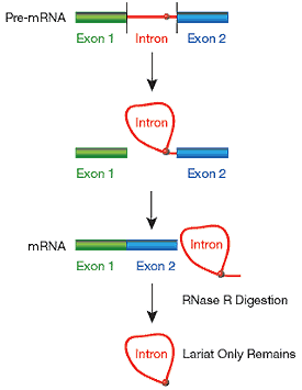隨著環(huán)狀RNA的深入研究,環(huán)狀RNA制備問題就越來越備受關(guān)注。Lucigen提供大腸桿菌來源的RNase R,是一種Mg依賴性的3’ →5’核糖核酸外切酶,能消化基本上所有線性RNA,但不消化套索或環(huán)狀RNA的結(jié)構(gòu),或者3’突出短于7個(gè)核苷酸的雙鏈RNA。即是除了tRNA,5S RNA和內(nèi)含子套索結(jié)構(gòu)外,大多數(shù)細(xì)胞RNA都將被RNase R完全消化。如圖4,RNase R可從總RNA中分離出內(nèi)含子前體mRNA剪切產(chǎn)生的套索RNA。以這種方法獲得的RNA作為模板來生產(chǎn)標(biāo)記的cDNA,可作為含有潛在的內(nèi)含子序列的微陣列的目標(biāo),或者用于包含完整的染色體或者基因組的重疊區(qū)域平鋪陣列。產(chǎn)生的cDNA不代表線性內(nèi)含子,但其含有的序列是來源于內(nèi)含子的。