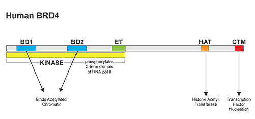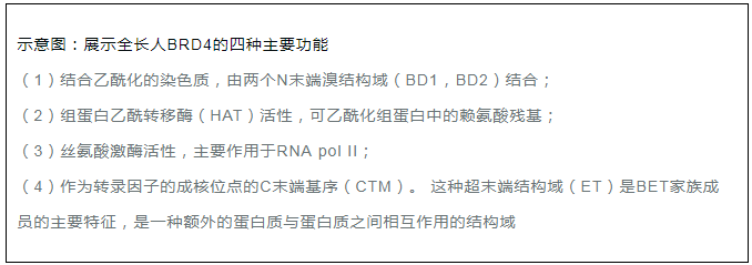 溴結(jié)構(gòu)域蛋白的BET家族的主要特征是它們都存在兩個(gè)溴結(jié)構(gòu)域和一種超末端(ET)結(jié)構(gòu)域2,6。其中,BRD4是研究較深入的。 BRD4具有四個(gè)主要的分子功能:(i)可以通過(guò)結(jié)合乙?;M蛋白維持染色質(zhì)結(jié)構(gòu),這種活性是由它的N-末端結(jié)構(gòu)域中的位點(diǎn)調(diào)控的; (ii)可以通過(guò)其HAT催化結(jié)構(gòu)域發(fā)揮組蛋白乙酰轉(zhuǎn)移酶(HAT)活性2,6; (iii)絲氨酸激酶活性,主要作用于RNA pol II;(iv)C端結(jié)構(gòu)域,可以發(fā)揮轉(zhuǎn)錄因子和復(fù)合物的結(jié)合和成核位點(diǎn)。研究發(fā)現(xiàn),BRD4常出現(xiàn)在幾種轉(zhuǎn)錄復(fù)合物,包括常見(jiàn)的輔因子調(diào)控子和P-TEFb 延伸因子6。 其C端結(jié)構(gòu)域也可以調(diào)控BRD4與許多眾所周知的轉(zhuǎn)錄調(diào)節(jié)因子之間的相互作用,顯著的有:P-TEFb,MYC,NFκb 以及p532,4,6-8等。
