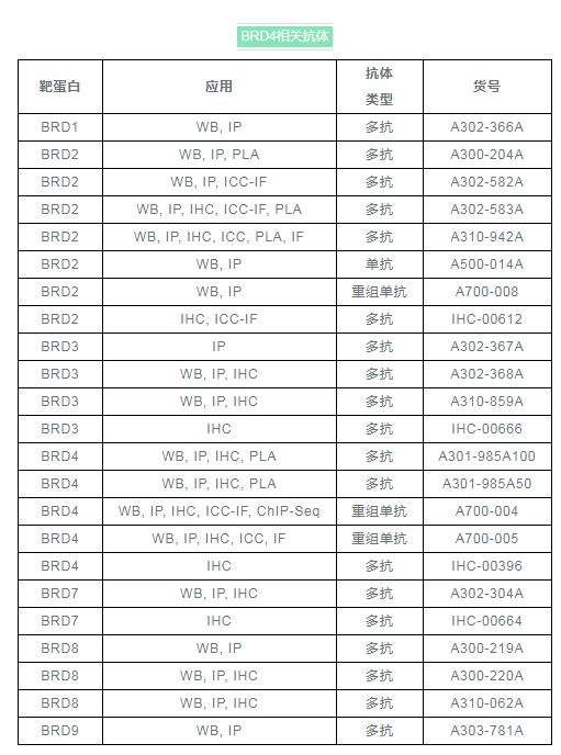 Bethyl認(rèn)識(shí)到BRD4在細(xì)胞周期調(diào)控和腫瘤發(fā)生中的重要性,研發(fā)了質(zhì)量?jī)?yōu)秀的BRD4抗體,以及許多其他相關(guān)蛋白質(zhì)的抗體,以促進(jìn)癌癥研究發(fā)展。