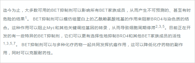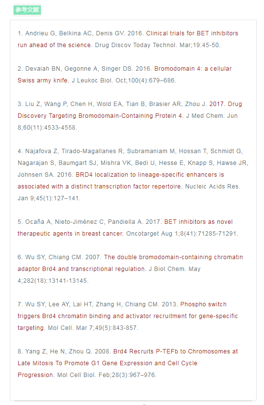BRD4(溴結(jié)構(gòu)域蛋白4)是一種轉(zhuǎn)錄調(diào)節(jié)因子。研究發(fā)現(xiàn),BRD4在癌癥、自身免疫和炎癥性疾病中具有重要的作用1,2。 正常生理情況下,BRD4主要參與細(xì)胞周期過(guò)程中的基因表達(dá)調(diào)控,其可以與乙?;旧|(zhì)結(jié)合,保持各種基因在細(xì)胞分裂循環(huán)過(guò)程中的穩(wěn)定表達(dá) ,這種現(xiàn)象被稱為表觀遺傳記憶或基因轉(zhuǎn)錄的“書簽”2,7。 同時(shí),BRD4在調(diào)控分化和發(fā)育中也起著關(guān)鍵作用2,4。 如果BRD4缺失,骨髓干細(xì)胞將不能分化成為B和T細(xì)胞2。 BRD4亦是MEFs或B細(xì)胞重編程為誘導(dǎo)多能干細(xì)胞過(guò)程中重新表達(dá)干細(xì)胞基因所必需的,在成骨細(xì)胞分化過(guò)程中BRD4也發(fā)揮重要作用。 綜上,BRD4在細(xì)胞周期調(diào)控和分化中的重要作用使其成為癌癥和免疫系統(tǒng)疾病的新興治療靶點(diǎn)。