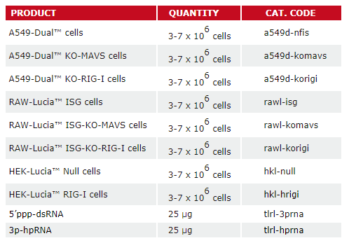 InvivoGen提供一系基于人源肺癌細(xì)胞株A549,小鼠巨噬細(xì)胞RAW和人源胚腎細(xì)胞HEK293穩(wěn)轉(zhuǎn)細(xì)胞系,助力RNA感受器RIG-I信號通路的研究。這些細(xì)胞系包括RIG-I或MAVS基因的敲除細(xì)胞株(衍生自A549或RAW細(xì)胞系)或者RIG-I基因的過表達(dá)細(xì)胞株(衍生自HEK-293細(xì)胞系)。