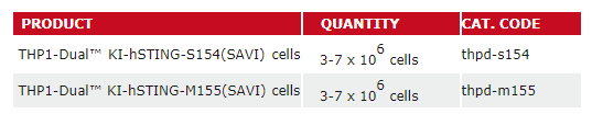 InvivoGen提供給一系列基于人源THP1單核細(xì)胞系的STING突變體的報(bào)告基因細(xì)胞株。其中,有兩款表達(dá)STING- associated vasculopathy with onset in infancy(SAVI)的功能獲得性突變體(S154 and M155)。SAVI患者在STING蛋白中顯示出單一突變,導(dǎo)致其持續(xù)激活和ISG的過度活化。S154是新生突變[1],M155是遺傳突變[2]。STING SAVI報(bào)告基因細(xì)胞株是篩選STING通路抑制劑便捷有力的工具。