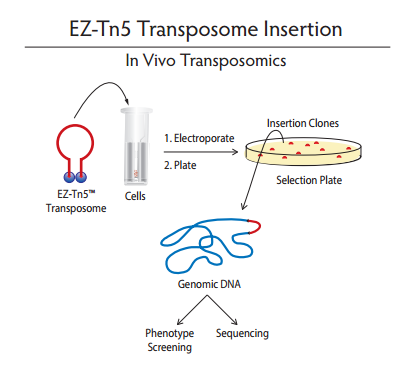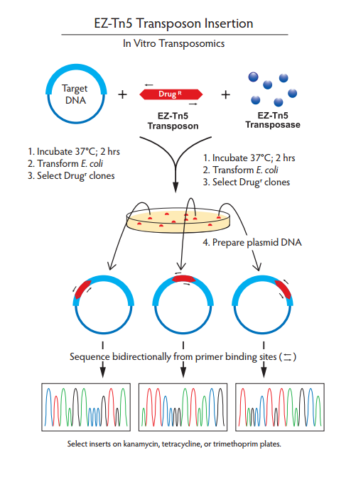EZ-Tn5轉(zhuǎn)座子可在體外插入到含有靶DNA的載體。當(dāng)EZ-Tn5轉(zhuǎn)座子在沒有鎂離子孵育時(shí),形成穩(wěn)定的EZ-Tn5轉(zhuǎn)座體復(fù)合體,可以被電擊進(jìn)入活細(xì)胞,一旦進(jìn)入細(xì)胞中,轉(zhuǎn)座體由細(xì)胞內(nèi)鎂離子活化,就能隨機(jī)插入到宿主的基因組DNA中。