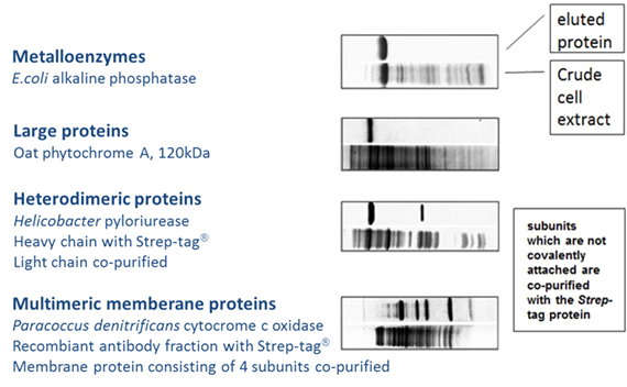 因His-tag系統(tǒng)使用Ni離子,所以在純化金屬蛋白(多數(shù)為酶)時(shí),可能會(huì)受到金屬間交互作用的干擾。而使用Strep-tag? 則不會(huì)出現(xiàn)此問題,因?yàn)镾trep-Tactin? XT與Strep-tag?的特異性結(jié)合不受金屬離子影響。且因其溫和的純化流程,所以還能用于純化大型蛋白、多亞基的蛋白復(fù)合體或是跨膜蛋白,并且保持蛋白功能。以Strep-tag?系統(tǒng)純化出不同的蛋白實(shí)例如下: