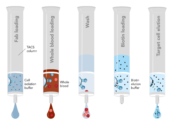 Fab-TACS柱子填充了包被有Strep-Tactin多聚體的細胞級瓊脂糖基質(zhì),偶聯(lián)上Strep-tagFab片段(Fab-Streps)特異性的結(jié)合到瓊脂糖基質(zhì)上。隨后,加入全血或其他血液制劑流過柱子。目的細胞通過特異性的與Fab-Streps作用從而結(jié)合到瓊脂糖基質(zhì)上,其他非目的細胞則有效的被洗去。最后,加入生物素使目的細胞從Fab-Streps上解離。至此,就已分離得到不帶任何標記的、真實的目的細胞可用于下游的實驗研究。