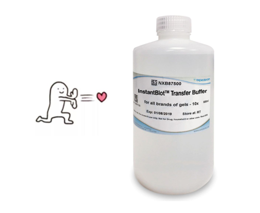 當(dāng)然蛋白電泳只是WB實驗的第一步,那還有什么方法能加快后續(xù)實驗(如轉(zhuǎn)膜)進程呢?別急,今天就給大家介紹一款來自分子產(chǎn)品專家Expedeon公司的快速轉(zhuǎn)膜液——InstantBlot?Transfer Buffer貨號:NXB87500),作為Expedeon的一款專利產(chǎn)品,該轉(zhuǎn)膜液能夠大幅提升蛋白從“膠”至“膜”的轉(zhuǎn)移速度,最快只需10 min即可完成轉(zhuǎn)膜,并且不會產(chǎn)生過多的熱量,避免影響蛋白的后續(xù)檢測。