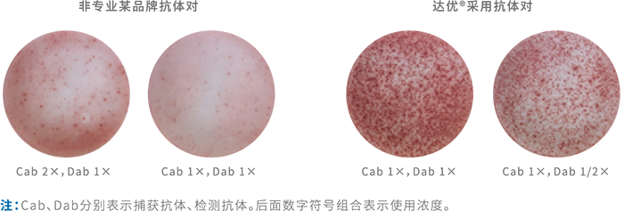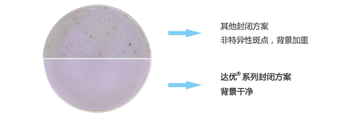 不同的檢測(cè)樣本在板孔培養(yǎng)過(guò)程中,受各種實(shí)驗(yàn)條件影響,如果封閉不當(dāng)都可能產(chǎn)生非特異性顯色,導(dǎo)致非特異性斑點(diǎn)的產(chǎn)生或者背景顏色的加重。這將直接影響到最后結(jié)果的判斷分析。達(dá)優(yōu)?系列產(chǎn)品通過(guò)大量實(shí)驗(yàn),對(duì)不同來(lái)源、不同配方封閉方法進(jìn)行封閉效果的對(duì)比試驗(yàn),篩選出更高效的封閉系統(tǒng),并將之運(yùn)用到系列試劑盒產(chǎn)品中。