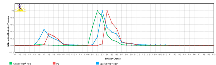 Spark Blue?550488nm藍色激光激發(fā)并在550nm處發(fā)射,介于AlexaFluor?488FITCPE的峰值發(fā)射之間。SparkBlue?550的亮度與FITC相當。405nm紫外激光可以進一步增加這幾種熒光不互相混合的情況。