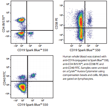 使用抗CD19-Spark Blue?550CD4-BV570?、CD38-PE以及CD40-FITC等不同組合抗體對人全血進行染色。圖中數據均來至于淋巴細胞門。結果可以看出SparkBlue?550可以完全與FITCPE熒光區(qū)別開,該數據使用Cytek?Aurora流式儀檢測。