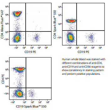 用抗CD4和抗CD19的不同熒光抗體組合對人全血染色,結果顯示Spark Blue?550染色具有有效性以及和其他常見熒光PE、AF647相比染色后相應群體比例也具有一致性。
