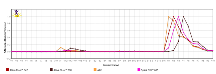 由于近紅外(NIR)范圍內的熒光發(fā)射光譜以及光電倍增管(PMT)對800nm以上發(fā)射波長的不敏感性,633nm紅色激光器僅限于2-3個熒光。借助全光譜流式細胞儀,APCAlexaFluor?700的發(fā)射峰之間的光譜間隙可檢測Spark NIR?685等新型熒光。Spark NIR?685可被633 nm激發(fā),最大發(fā)射波長為685 nm,與FITC具有相似的亮度。