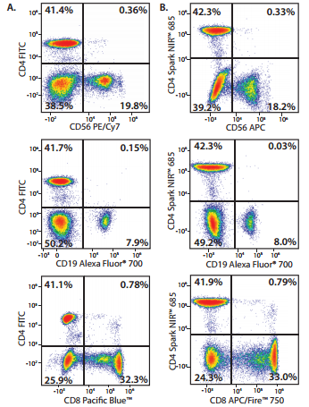 來自相同供體的全血用圖AB配色方案染色。A包括抗人CD4-FITC、CD19-Alexa Fluor700、CD8-PacificBlue TM、CD3-PE以及CD56-PE-Cy7的抗體。B包括抗人CD4-Spark NIR TM685、CD19-AlexaFluor 700、CD8-APC-FireTM 750CD3-PE以及CD56-APC的抗體。