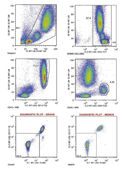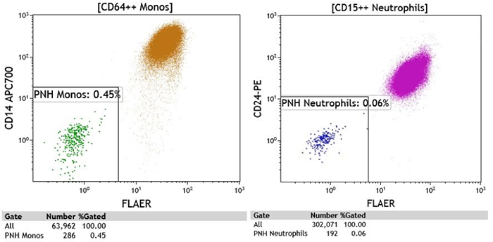 圖:取新鮮PNH病人外周血裂紅后用FLAER染色,分析單核細(xì)胞、粒細(xì)胞中的PNH克隆數(shù) [1]。