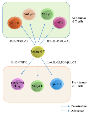 以人的γδT細胞為例,用不同的細胞因子以及磷酸化的抗原刺激后,靜息的γδT細胞可以極化為FoxP3+γδTregγδT17、γδTfhγδT1,或成為活化的Vδ1T、Vδ2T細胞亞群。