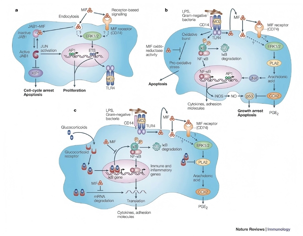 當(dāng)用 LPS 刺激時(shí),巨噬細(xì)胞釋放 MIF。免疫細(xì)胞的其他促炎效應(yīng)分子,如 TNF 和 IFN-γ,也是巨噬細(xì)胞產(chǎn)生 MIF 的強(qiáng)誘導(dǎo)劑。MIF 在組織或體循環(huán)中釋放后,作為一種經(jīng)典的促炎細(xì)胞因子,通過激活巨噬細(xì)胞和 T 細(xì)胞來促進(jìn)先天性和適應(yīng)性免疫反應(yīng)。