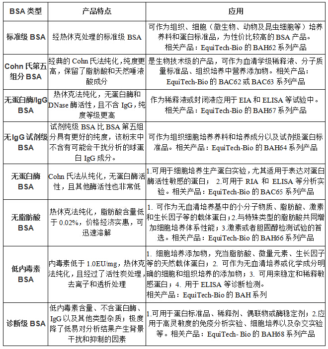 牛血清白蛋白Albumin from bovine serum,BSA,又稱為組分V或Cohn V,名稱起源于BSA的分餾法——Cohn 冷乙醇法, Cohn 冷乙醇法是由哈佛大學(xué)Edwin Cohn教授于1946年發(fā)明的。當(dāng)時(shí)基于戰(zhàn)爭(zhēng)創(chuàng)傷治療對(duì)注射級(jí)別蛋白的大規(guī)模需求,Cohn教授在較低的溫度下改變血漿的乙醇濃度和pH值,使其所含蛋白在不同乙醇濃度下析出,在第五個(gè)析出的組分中主要成分為BSA,所以BSA又稱組分V或Cohn V。Cohn法仍然是目前非常普遍的BSA分餾法。 美國(guó)大的生物原材料供應(yīng)商Equitech-Bio提供經(jīng)典冷乙醇法和先進(jìn)的熱休克法純化的高質(zhì)量、分類齊全的BSA,助力您的實(shí)驗(yàn)!