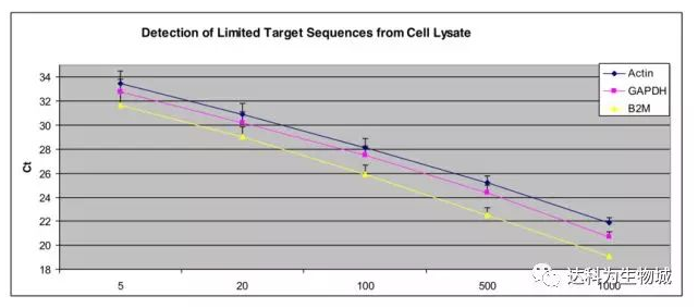 隨著HeLa細胞數(shù)的增加,分別用適量細胞裂解液裂解細胞后進行反轉(zhuǎn)錄,而后在7700 PCR儀上進行Actin、GAPDH和B2M基因的3復孔qPCR反應。