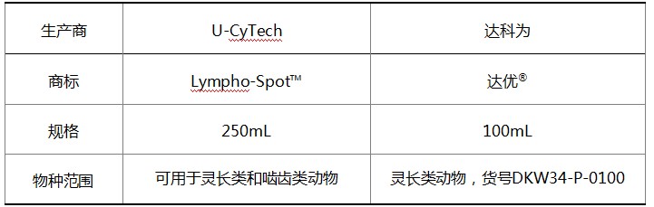 目前,我們同時(shí)提供U-CyTech原產(chǎn)的Lympho-Spot?無(wú)血清培養(yǎng)基和U-CyTech授權(quán)達(dá)科為在國(guó)內(nèi)生產(chǎn)的達(dá)優(yōu)?無(wú)血清培養(yǎng)基。它們的原料來(lái)源與質(zhì)控標(biāo)準(zhǔn)完全相同,能獲得同樣出色的檢測(cè)結(jié)果。由于物種的差異,部分添加成分在靈長(zhǎng)類和嚙齒類之間有差別。U-CyTech公司采取了同時(shí)添加的策略,所以生產(chǎn)出的是通用達(dá)優(yōu)?無(wú)血清培養(yǎng)基;達(dá)科為公司采取的是分別添加的策略,所以生產(chǎn)出的是專用達(dá)優(yōu)?無(wú)血清培養(yǎng)基,分靈長(zhǎng)類和嚙齒類兩個(gè)品種。詳細(xì)的差別見(jiàn)下表。