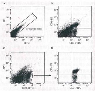 雖然死細胞位于散點圖的對角線上,但是對角線上的細胞確不一定是死細胞,因為雙陽性細胞如果在x軸和y軸的熒光信號相似時,也可以位于對角線上。所以,散點圖對角線上的細胞可能是死細胞,也可能是雙陽性細胞。如圖1-B所示,樣本細胞為正常小鼠脾臟細胞,標記 FITC-抗CD3抗體和PE-抗CD4抗體,F(xiàn)ITC和PE雙陽性的CD4 T細胞和死細胞混在一起,無法區(qū)分。但是死細胞和雙陽性細胞的形狀是不一樣的,死細胞呈現(xiàn)連續(xù)的線型分布,而雙陽性細胞群呈現(xiàn)圓形的群體分布,因此,可以從對角線上的細胞群體的形狀大致判斷細胞的性質(zhì)。雖然不能根據(jù)熒光強度的強弱來區(qū)分該熒光信號是來自于死細胞的非特異性熒光還是來自熒光素產(chǎn)生的熒光,但是可以利用在散點圖上死細胞位于對角線的特點來區(qū)分死細胞和陽性活細胞。如圖1-C所示,x軸表示FITC通道(樣本細胞標記有FITC-抗CD3抗體),y軸表示APC通道(閑置通道),借用該散點圖可以明確區(qū)分圖1-B中無法區(qū)分的死細胞和雙陽性細胞。此時只需要將排除了死細胞后的CD3 T細胞設(shè)門,將門內(nèi)的細胞顯示于新的FITC-PE散點圖中,如圖1-D,此時該散點圖內(nèi)的細胞都是活細胞,因為樣本細胞同時標記有PE-抗CD4抗體,所以圖中的細胞明顯分為兩群,雙陽性的是CD4T細胞,單陽性的是CD8 T細胞。