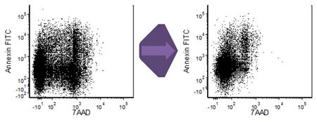 圖為:體外培養(yǎng)一天的C57BL/6小鼠脾細胞做Annexin V/7-AAD染色的流式數(shù)據(jù)。其中,左邊為未經(jīng)固定處理的細胞上機檢測結(jié)果; 右邊為經(jīng)過70%EtOH, 1.5%PFA固定處理的細胞上機檢測結(jié)果。