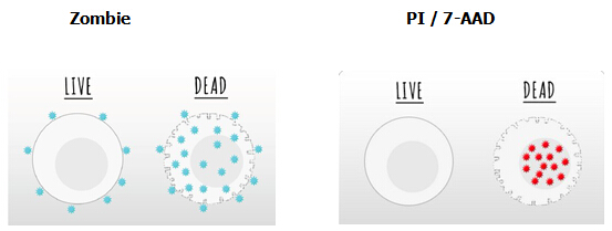Zombie Dyes有別于PI和7-AAD等DNA染料,它是一種可用于需固定細胞實驗的染料,通過與細胞上蛋白質(zhì)的氨基結(jié)合來實現(xiàn)。因活細胞可排除染料,所以僅細胞膜被著色;而死細胞的細胞膜及細胞質(zhì)均被著色,繼而根據(jù)熒光信號的強弱來區(qū)分死/活細胞。而且Zombie Dyes可選擇性多,可以由不同的激發(fā)光激發(fā),便于靈活選擇。