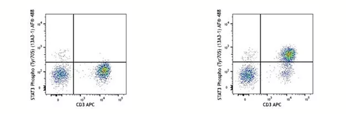 在蛋白翻譯后修飾(磷酸化、乙酰化、甲基化等)的研究過(guò)程中,固定劑不僅可以有效的“固定”住翻譯后修飾的位點(diǎn)(絲氨酸、蘇氨酸、酪氨酸等),也可以防止目標(biāo)位點(diǎn)在活細(xì)胞中很快降解(比如磷酸酶會(huì)去除磷酸化修飾、去甲基化酶會(huì)移除甲基化修飾等)。下面的例子是用IL-6的重組蛋白刺激人外周血15分鐘后看STAT3705位酪氨酸的磷酸化水平,在刺激完樣本后就需要通過(guò)固定來(lái)實(shí)現(xiàn)目的氨基酸磷酸化水平“停留”在IL-6刺激15分鐘這個(gè)節(jié)點(diǎn)上。