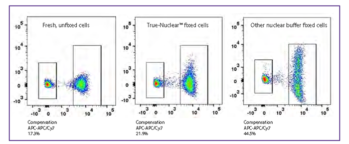 如果需要長(zhǎng)時(shí)間保存樣本,建議在樣本做完表面染色和固定后,保存在專門的保存緩沖液中。但即便是有專門的保存buffer,對(duì)于用了串聯(lián)染料(如APC/Cy7、PE/Cy7等)染色的樣本,我們還是建議不要長(zhǎng)時(shí)間保存,很難避免補(bǔ)償?shù)摹捌疲?/span>shift)”。