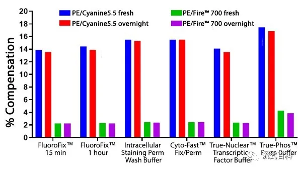 PE/Fire? 700 和PE/Cyanine5.5標(biāo)記的兩種CD4抗體檢測(cè)人裂紅外周血,抗體孵育完成后在固定洗滌馬上去檢測(cè)條件下和過(guò)夜后的條件下,在5激光Cytek? Aurora 光譜流式平臺(tái)檢測(cè),PE/Fire? 700 在不同的實(shí)驗(yàn)方案中對(duì)多聚甲醛的固定具有穩(wěn)定的抗性,表現(xiàn)出比PE/Cyanine5.5更優(yōu)秀的穩(wěn)定性,但是在磷酸化指標(biāo)的檢測(cè)方案中,PE/Fire? 700熒光素的穩(wěn)定性出現(xiàn)了一定程度的下降。