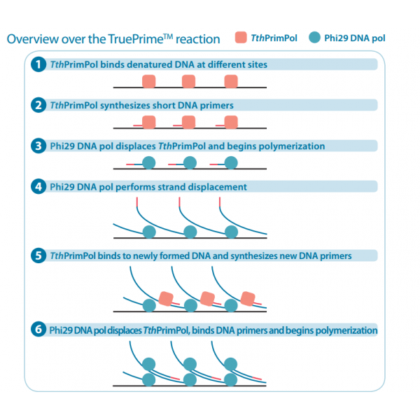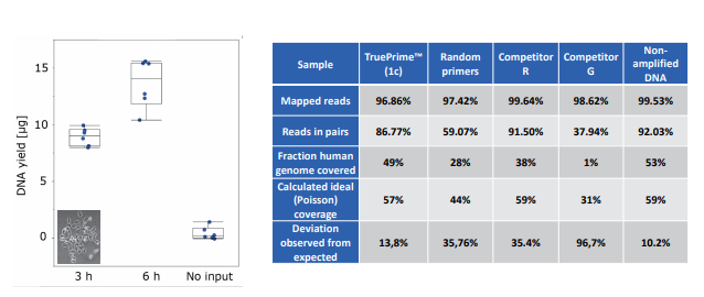 TruePrime?采用MDA技術(shù),基于新型的TthPrimPol 引物酶和Phi29 DNA聚合酶,擴(kuò)增過程無需添加隨機(jī)引物,減少了擴(kuò)增偏倚,提高了擴(kuò)增過程的覆蓋率和保真性,并且對(duì)于污染的外源DNA不敏感,可重復(fù)性好。TruePrime?可用于單個(gè)細(xì)胞或少量細(xì)胞的全基因組擴(kuò)增,與常見的NGS平臺(tái)如Illumina和IonTorrent等兼容性良好。