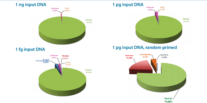 結(jié)果表明僅使用1fg 的樣本即可以擴(kuò)增出95%以上的人體基因組片段;而使用隨機(jī)引物擴(kuò)增的結(jié)果中,約有20%不匹配任何生物體的非特異性序列(右下圖)。