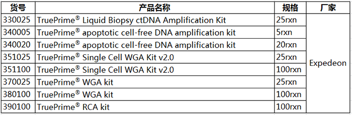 擴(kuò)增能力強(qiáng),無引物互作,無擴(kuò)增偏倚,覆蓋率高,保真性好,重復(fù)性好,集諸多優(yōu)勢(shì)于一身的TruePrime?,還有什么理由不選擇呢?TruePrime?會(huì)為您的單細(xì)胞測(cè)序工作帶來極大的便利!除此之外,Expedeon還提供用于擴(kuò)增cfDNA, circular DNA等多種類型DNA的試劑盒喲!