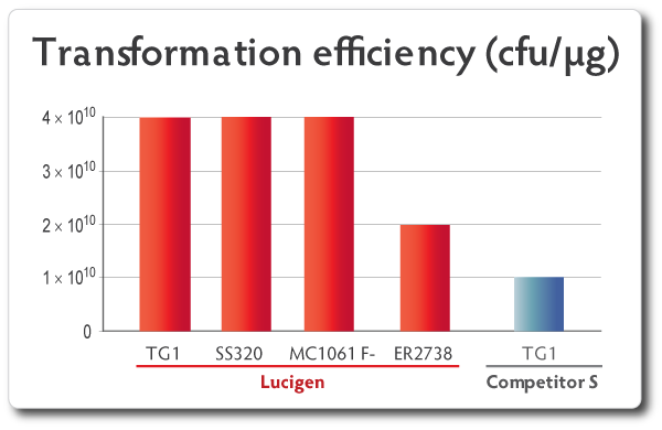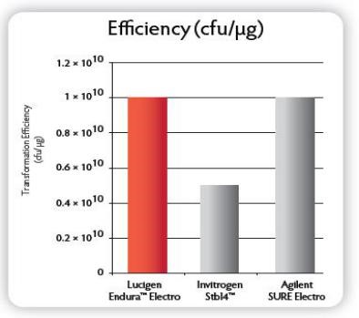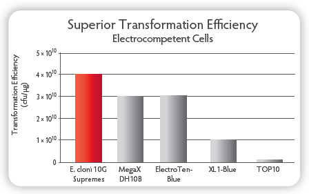 E. cloni? 10G ELITE電轉(zhuǎn)感受態(tài)轉(zhuǎn)化效率≧2×1010 cfu/μg,E. cloni? 10G化學轉(zhuǎn)感受態(tài)轉(zhuǎn)化效率≧1×109 cfu/μg;