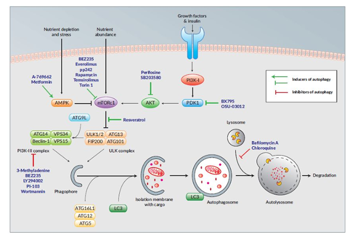 自噬是原生分解程序,由細胞內應激物(營養(yǎng)物和能量貧乏)引起。自噬由生成自噬體開始,這一步驟由一系列蛋白調控,包括VPS34的Ⅲ型磷脂酰基醇(PI)3激酶復合體,隨后與溶酶體的融合將自噬體酸化。自噬的阻斷有多種形式,例如Ⅲ型PI3激酶抑制劑可通過抑制自噬捕獲動作而阻斷自噬進程,或者用抑制溶酶體酸化的抑制劑阻止自噬溶酶體的形成和自噬降解。自噬進程是被縝密調控的。mTORC1,一種對營養(yǎng)物和生長因子敏感的激酶,是自噬的主要阻遏器。因此,mTORC1及其信號通路的抑制劑可誘導產生自噬。