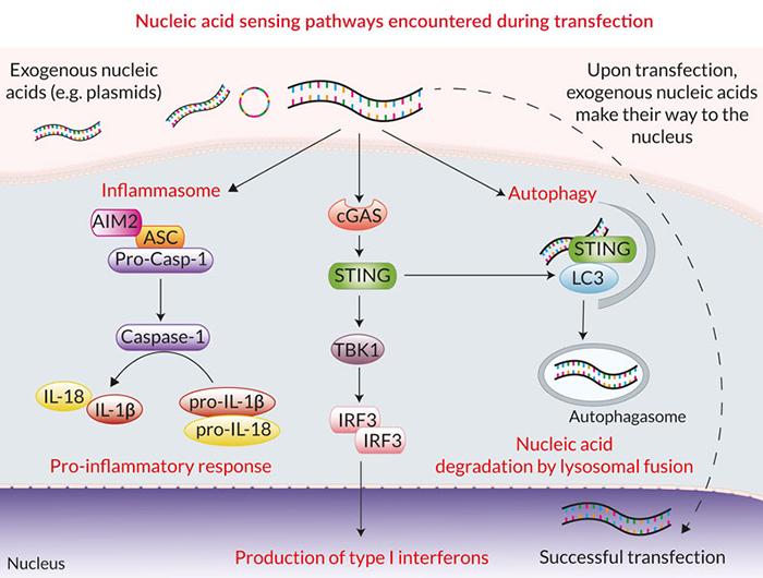 在真核細胞轉(zhuǎn)染期間,外源核酸(如質(zhì)粒DNA)的主要障礙是它們會被胞質(zhì)傳感器檢測,如cGAS/STING,AIM2炎癥小體和LC3介導(dǎo)的自噬。這些防御性級聯(lián)信號的激活通常會導(dǎo)致低轉(zhuǎn)染效率、降低的細胞活力和不一致的結(jié)果,尤其是在難轉(zhuǎn)細胞(如免疫細胞)的轉(zhuǎn)染實驗中。NATE?抑制許多核酸感應(yīng)途徑,從而保護外源DNA并促進其表達。