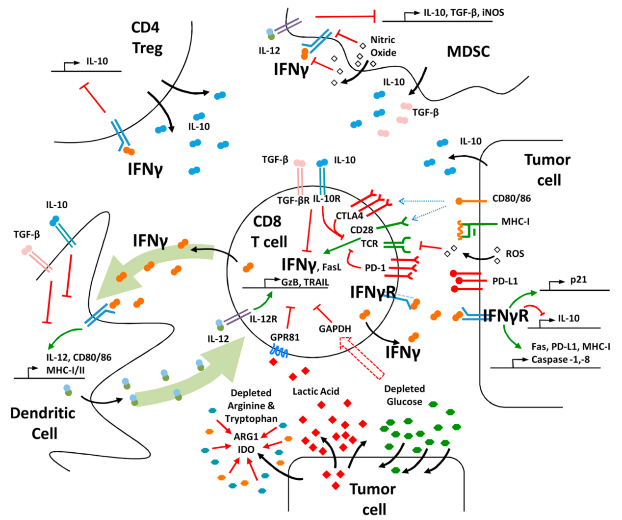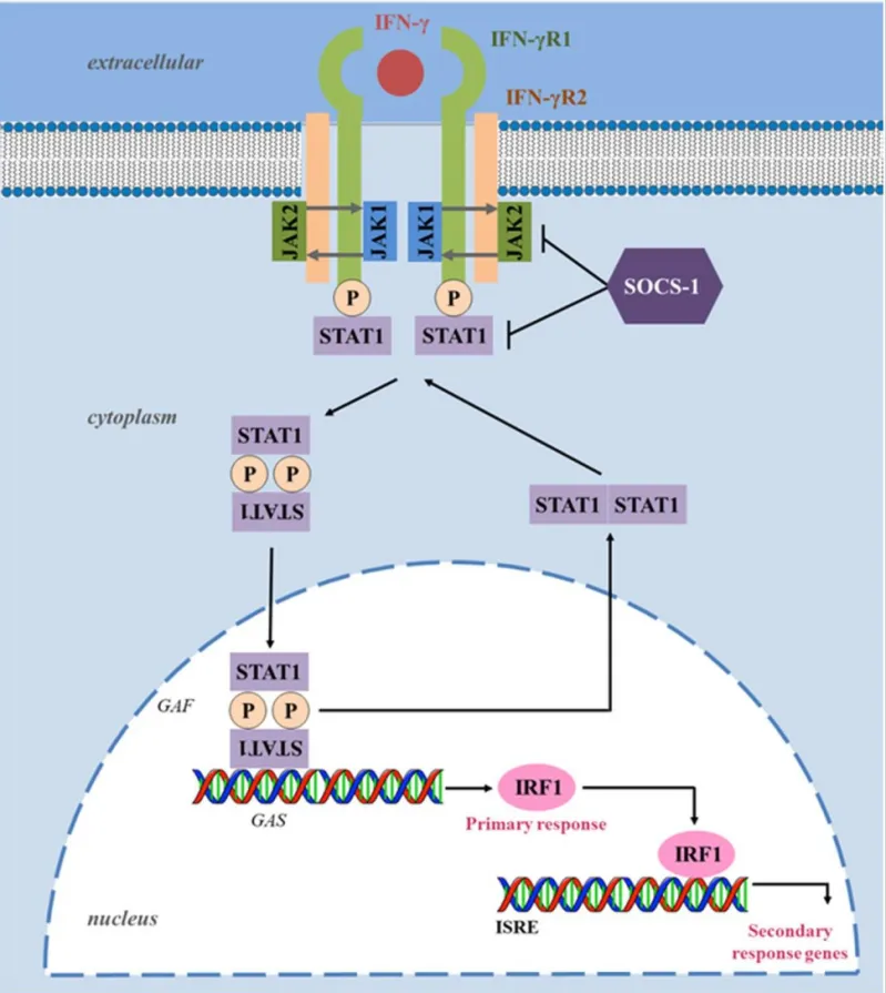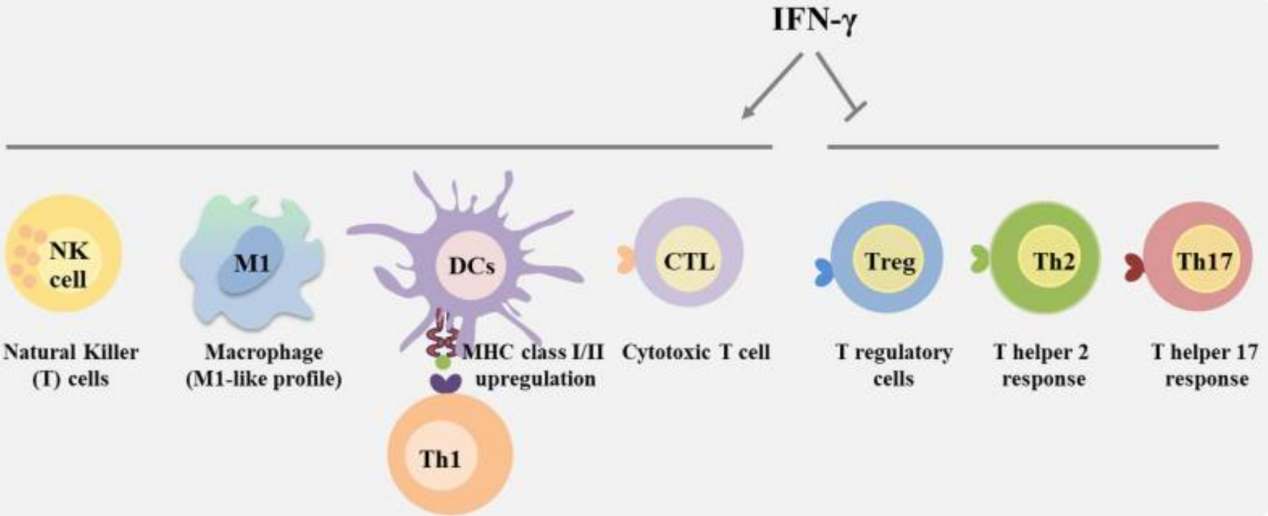 IFN-γ信號(hào)通路協(xié)調(diào)多種生物反應(yīng),在先天和適應(yīng)性免疫中扮演的重要角色。IFN-γ可以通過促進(jìn)Th1細(xì)胞、CD8+T淋巴細(xì)胞、NK細(xì)胞、樹突狀細(xì)胞及巨噬細(xì)胞的活性,抑制Treg、Th2和Th17細(xì)胞分化和功能,發(fā)揮免疫調(diào)節(jié)作用。此外,IFN-γ可激活巨噬細(xì)胞,使其分化為M1型巨噬細(xì)胞。